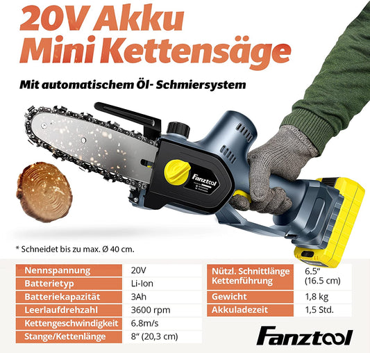 FANZTOOL 20V Akku Handsäge, Kettensäge mini 1,8 kg, EC-Motor, 3Ah Akku SMY100014