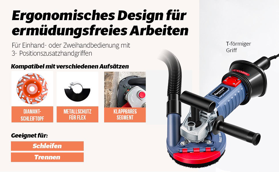The innovative design of the 3kg grinder and the T-shaped bracket as well as the ergonomic rubber handles enable fatigue-free work with maximum comfort.