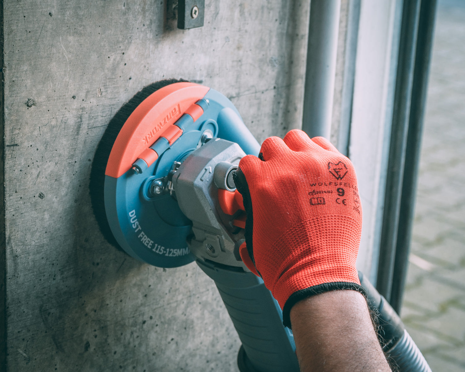 The extraction hood ensures optimal dust extraction, while at the same time the brush ring and a connected extraction system prevent large amounts of dust from escaping.