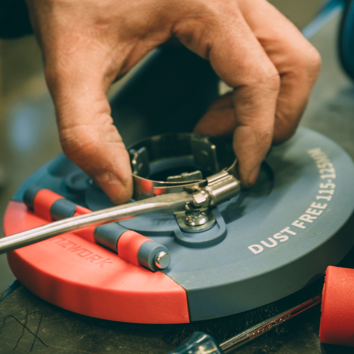 Thanks to the sturdy dust protection hood, flying chips are no longer a problem when sanding. In combination with an industrial vacuum cleaner, you get a clean working environment and protect your lungs.