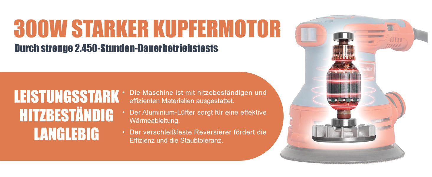HIGH PERFORMANCE – This powerful sander features a 300-watt copper motor tested for 24,500 hours of continuous operation. The unit is heat-resistant and ideal for extensive professional surface finishing.