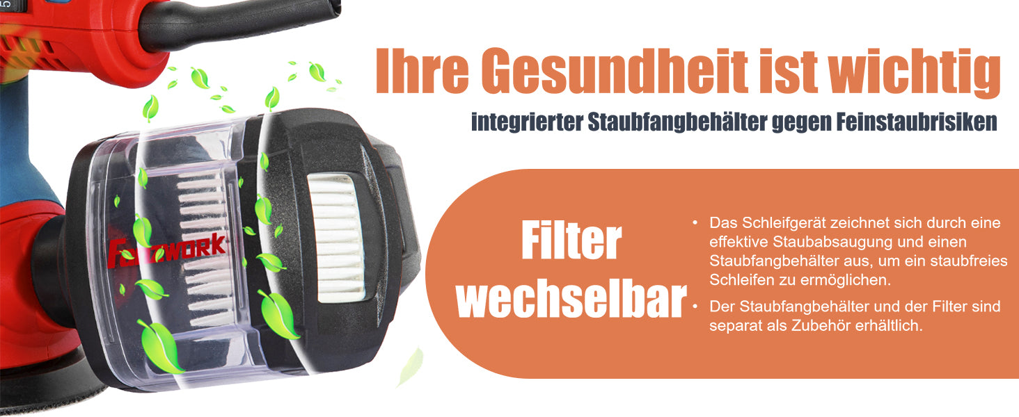 DUST-FREE WORK – The sander is equipped with an integrated dust container with a filter. This container is easy to clean and effectively filters out fine dust. The device can also be connected to a vacuum cleaner.