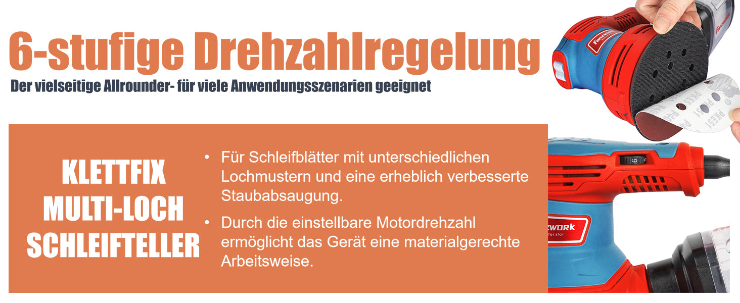 VARIABLE SPEED ADJUSTMENT – The sander features a 6-stage speed control, allowing optimal adaptation to different materials. It is particularly suitable for polishing wood and metal, removing rust, and polishing walls.