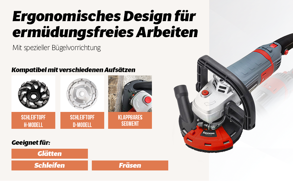 Grâce à la poignée ergonomique réglable en forme de « D », la ponceuse à béton FANZWORK est extrêmement maniable et conviviale, ce qui facilite grandement votre travail.