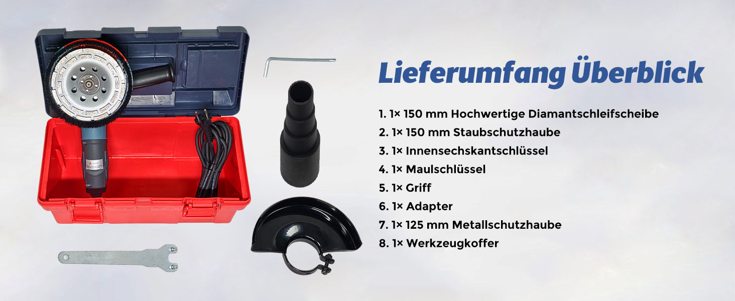 FANZWORK 1500W Betonschleifer Winkelschleifer Set mit Bürstenloser EC-Motor, Betonfräse mit 150mm Diamantschleiftopf *1, Absaughaube *1, Tragbox *1, Präzises & Wartungsfreies Schleifen
