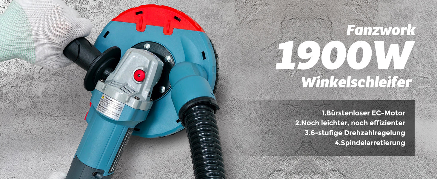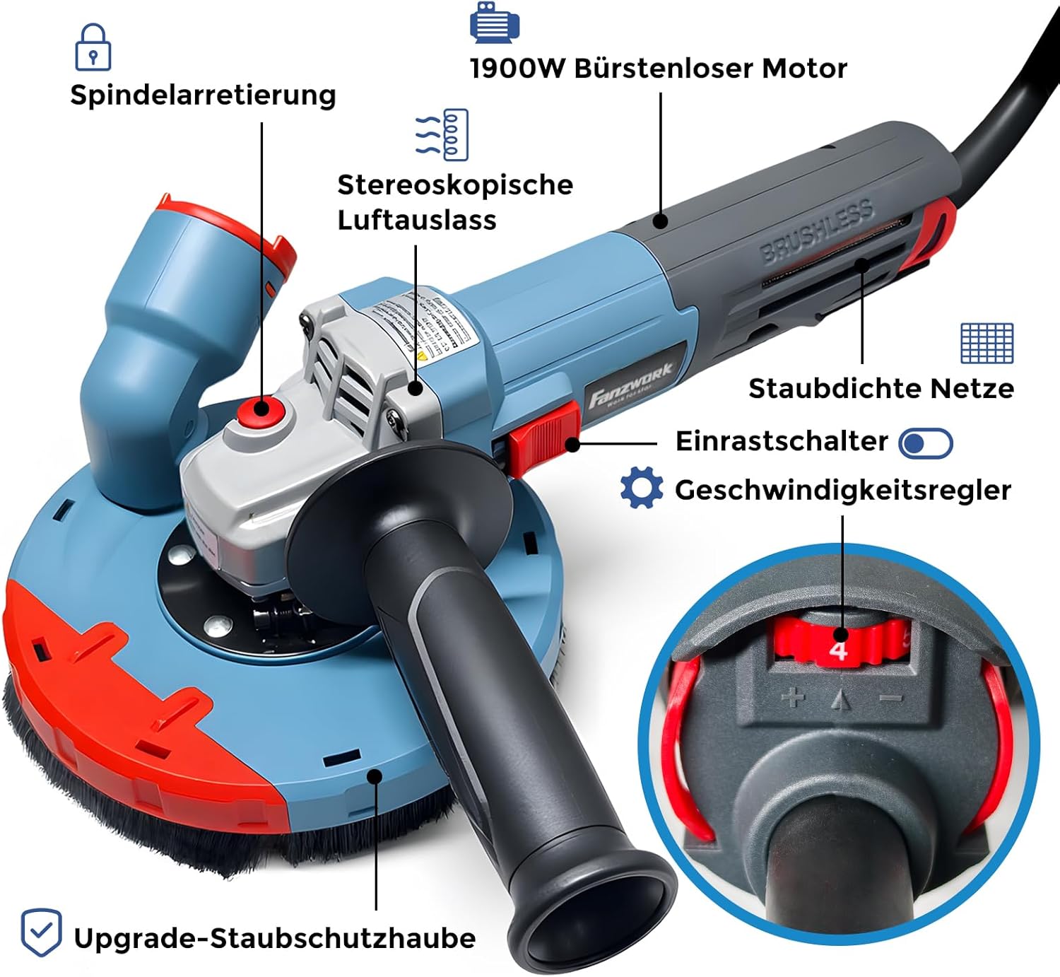 Fanzwork Winkelschleifer ist mit einer 6-stufigen Drehzahlregelung ausgestattet, sodass Sie die Geschwindigkeit je nach Material und Anwendung präzise anpassen können – ideal für Schleif-, Schneid- und Polierarbeiten an Metall, Stein oder Holz.
