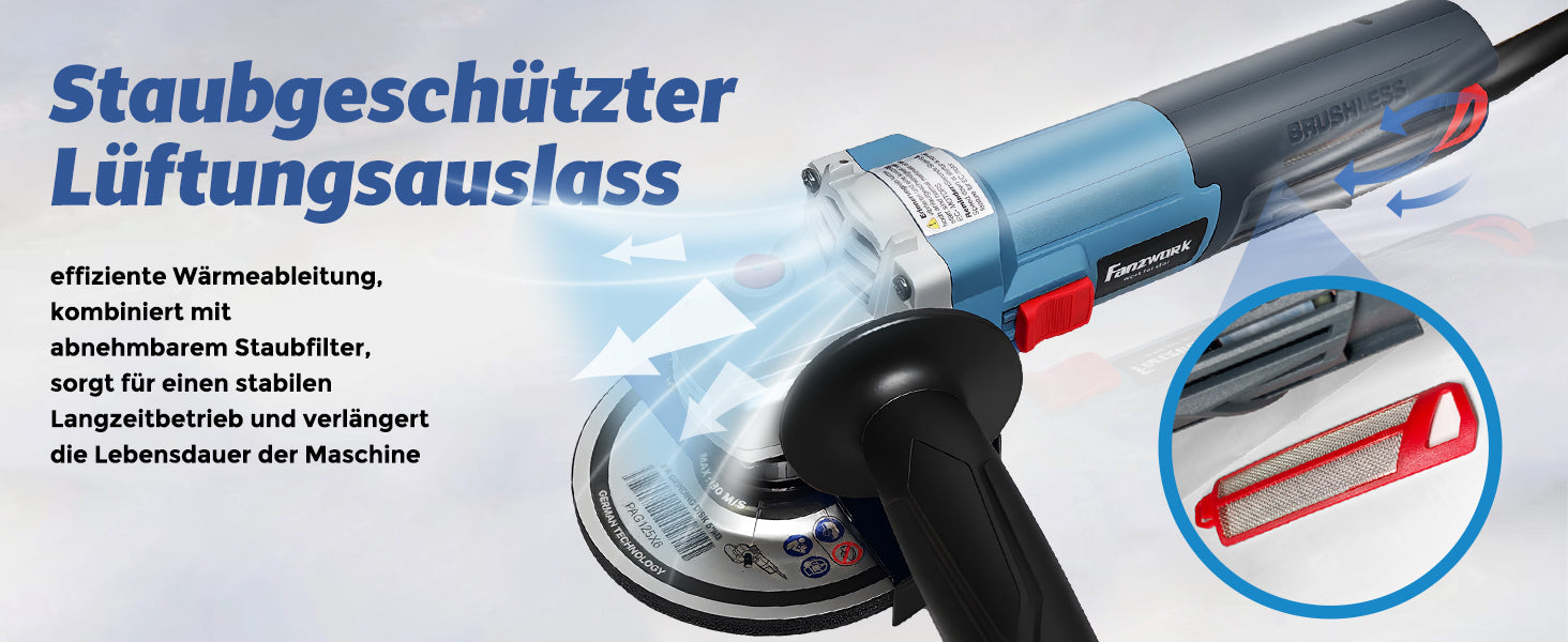 Ein weiterer Vorteil des FANZTOOL Betonschleifers ist der abnehmbare Staubfilter. Nach staubigen Arbeiten, wie dem Entfernen von Fliesenkleber oder beim Betonschleifen, kann der Filter einfach gereinigt werden. So bleiben die inneren Komponenten besser geschützt und das Gerät wird optimal gekühlt.